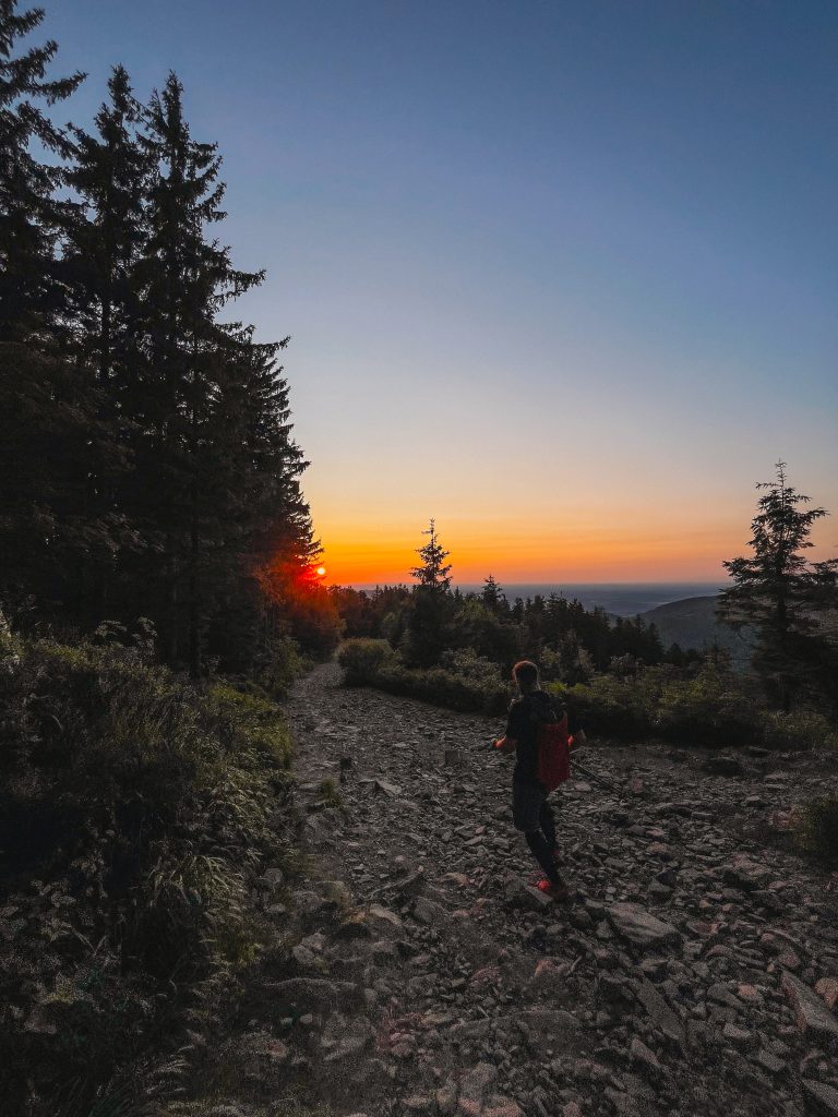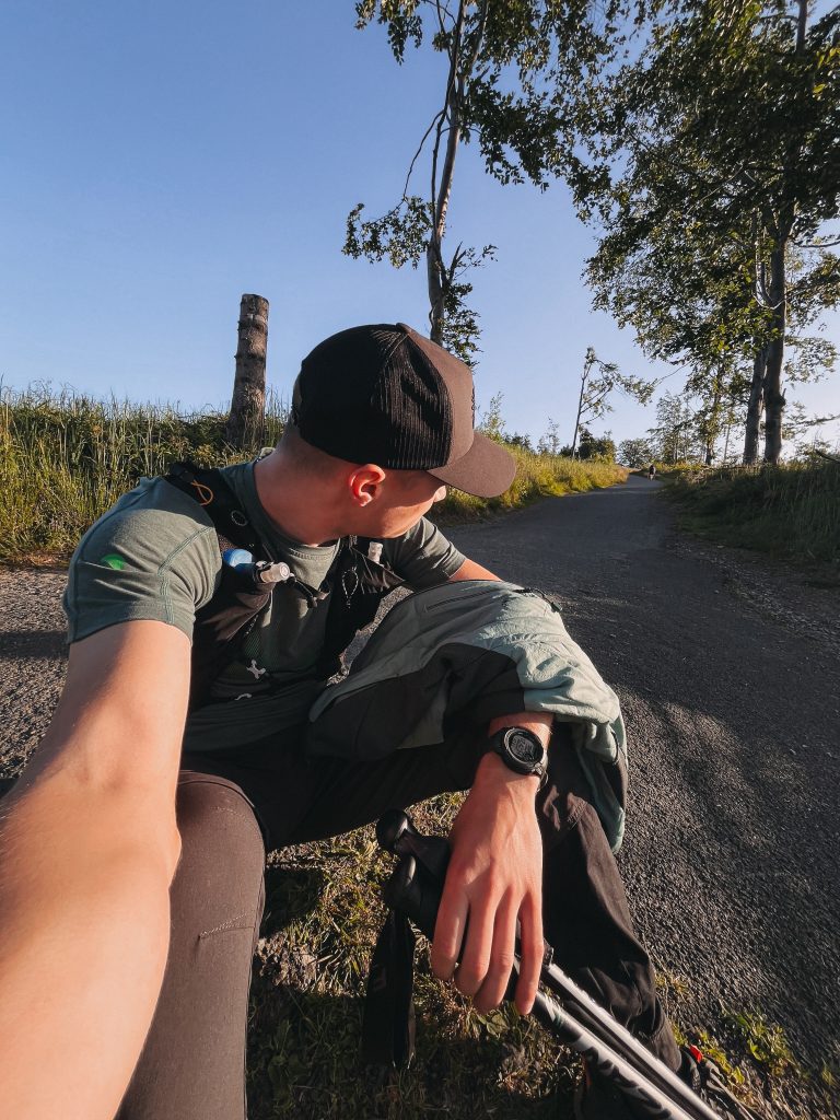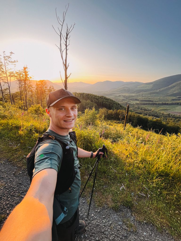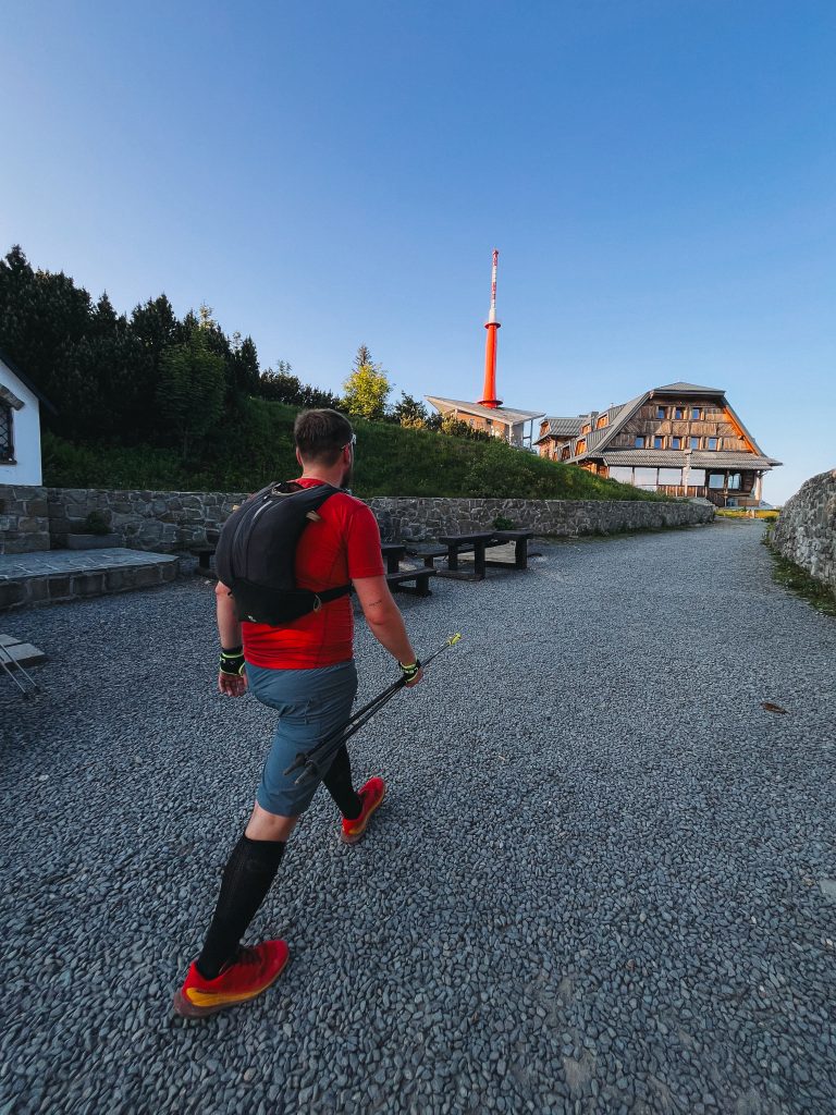 Když jsme u těch doporučení – kolem půlnoci jsme byli rádi za teplejší vrstvu, mikina v batohu přišla vhod. Na těžké pohorky raději zapomeňte a vezměte si trailové běžecké boty, vaše nohy vám v cíli poděkují. S velikostí batohu to nepřehánějte – mně naprosto stačila 10l běžecká vesta, do které se vešla voda, nějaká ta tyčinka i tenká bunda. Čím lehčí, tím líp.
