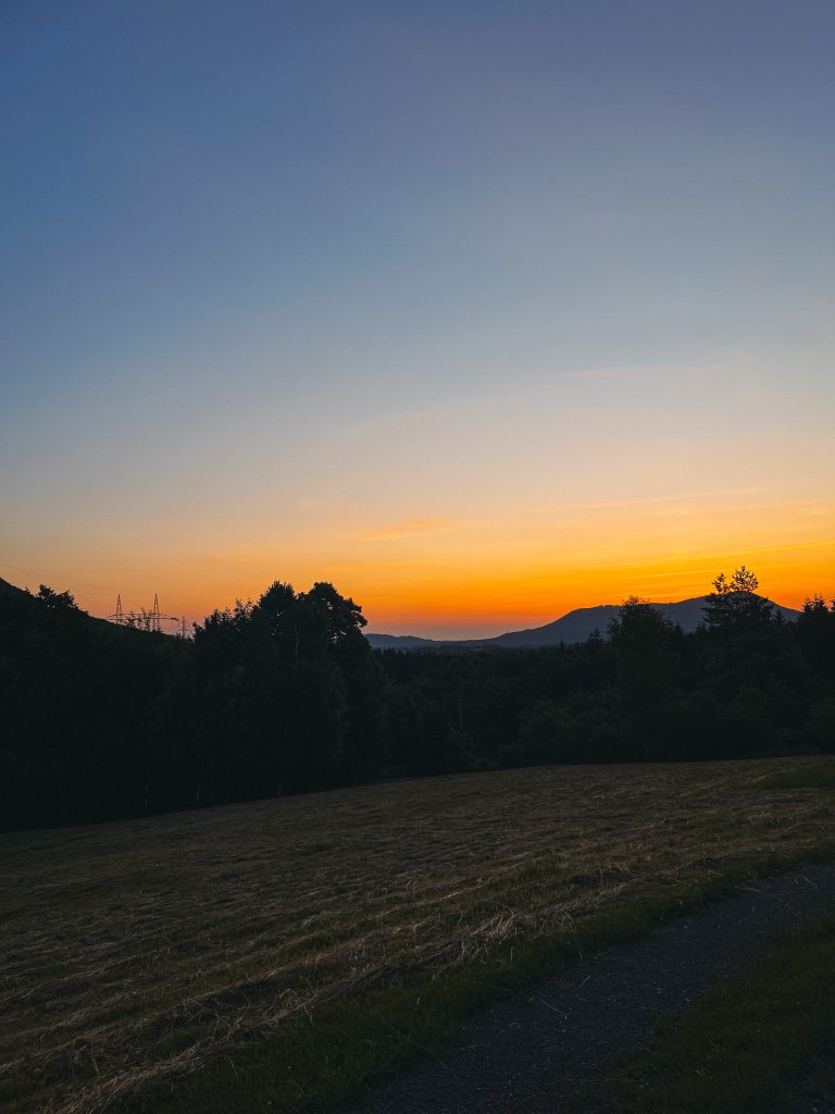 Po průchodu obcí jsme zapnuli čelovky. Bez nich to prostě nejde – a doporučuju mít buď náhradní baterky, nebo rovnou druhou čelovku v záloze. Celou noc si svítit mobilem fakt nechcete.