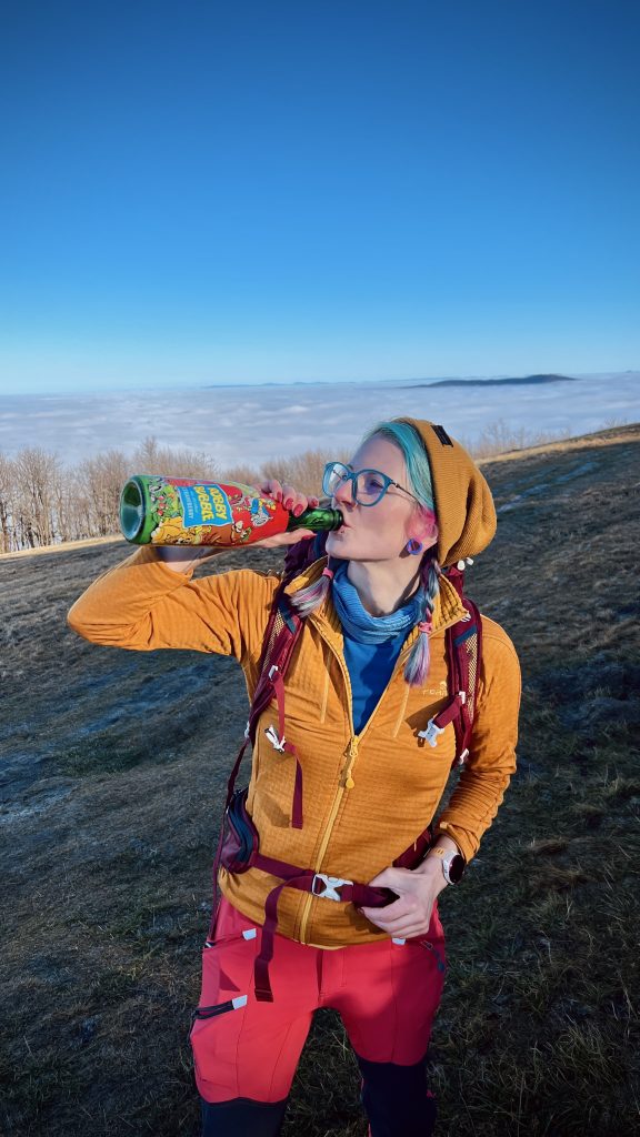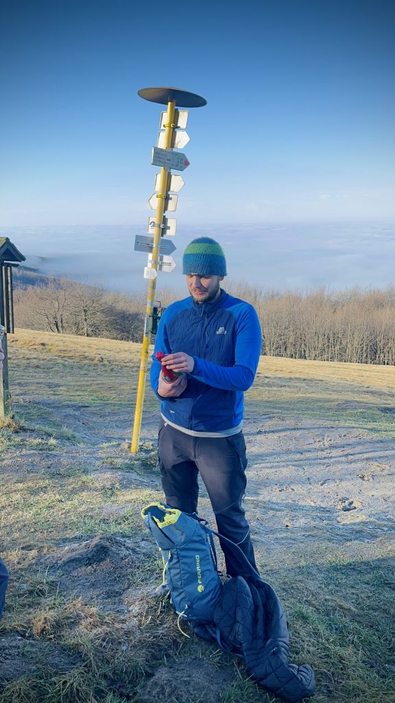 Na vrcholu u rozcestníku pod vysílačem Velká Javořina přišel slavnostní moment: bouchla se šáňa. Alko i nealko, protože nikoho nediskriminujeme, a protože někdo z nás měl ten nevděčný, ale záslužný úkol – řídit zpátky. ( Já… 😀 )