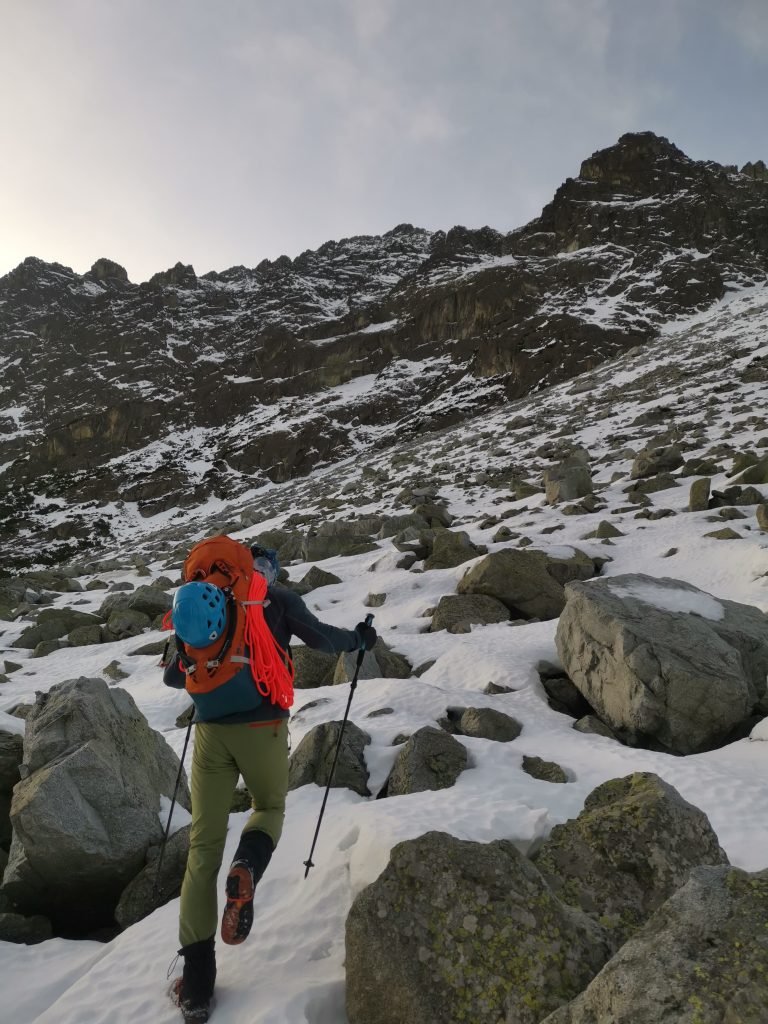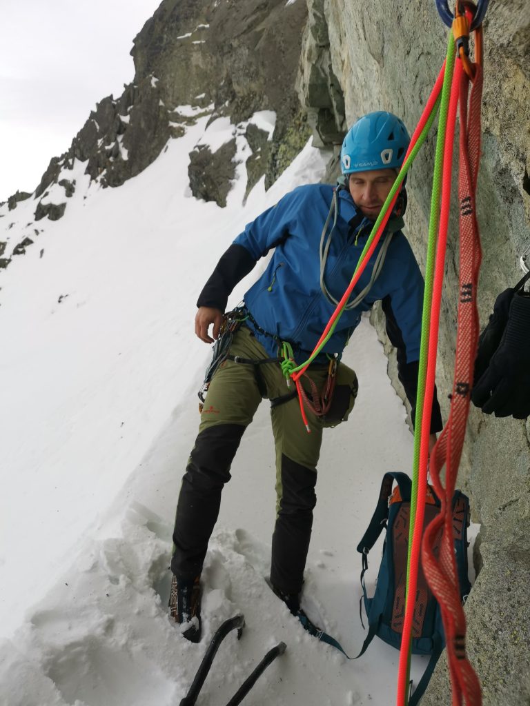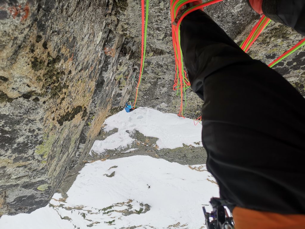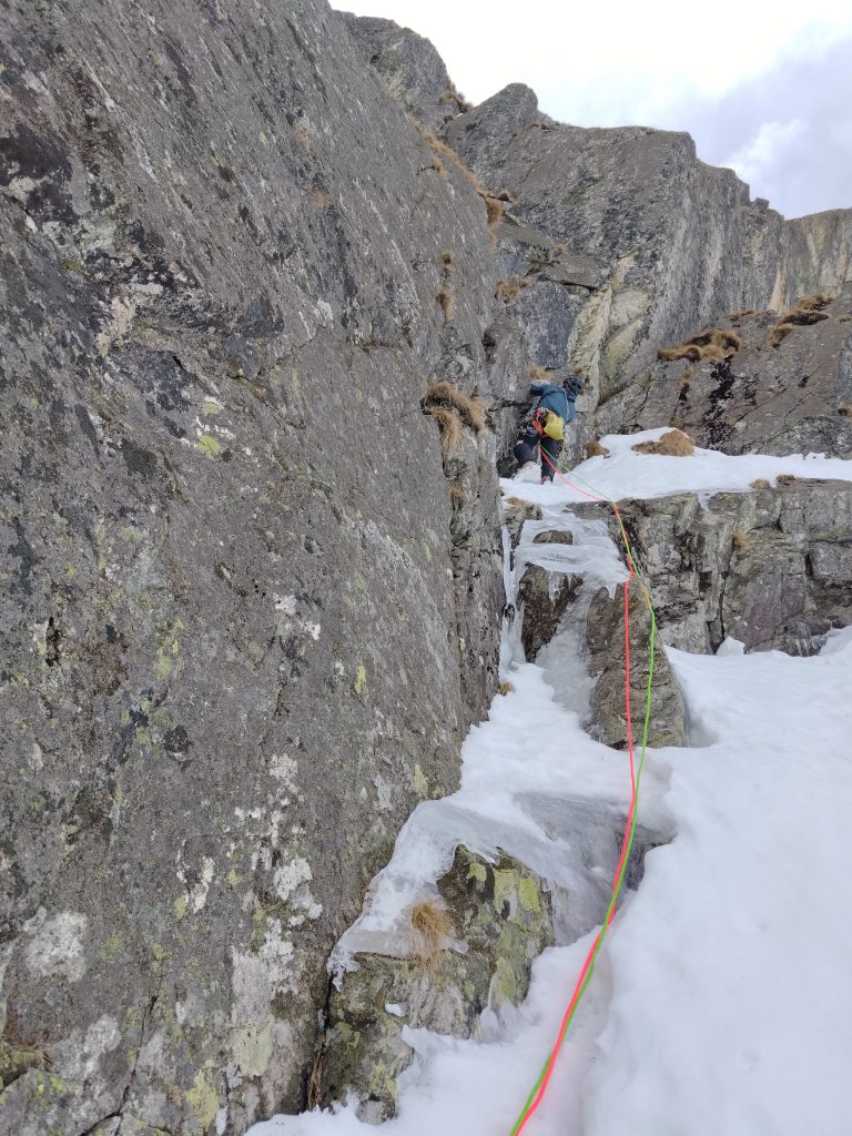 Ďalšia spojovacia dĺžka nás priviedla pod vyhliadnutú špárku. Optimizmus nás prešiel, keď Ďuri do toho naliezol a po chvíli sa špára otvorila, ani na ruky, ani na cepíny..ani nechápem, ako to ten človek preliezol, ja na druhom s batohom som sa tam miestami hompálal, ako ponožky na prádelnej šnúre a nevedel som čo mám robiť. Obtiažnosť M8+