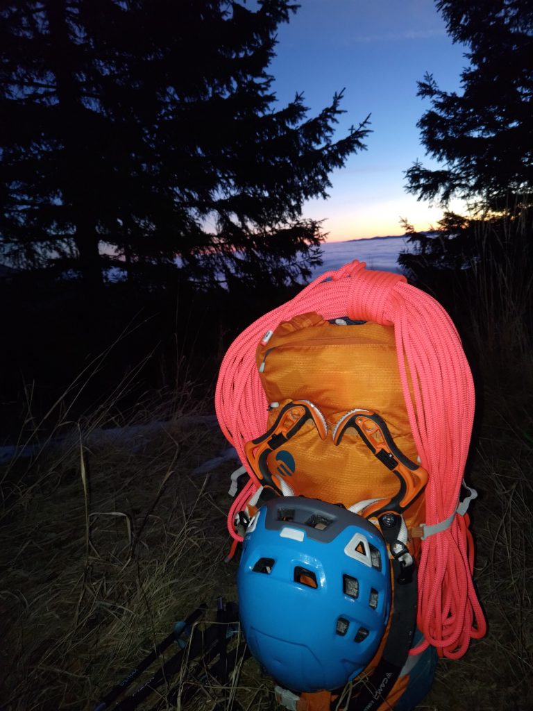 Posledná dĺžka bola veľmi pekná, lezenie príjemnej obtíažnosti, tak M6+, jemne traverzuje stenu. Ďuri doliezol už za tmy za mnou a podarilo sa nám nájsť zlaňáky z cesty Rehabilitácia, takže už známym terénom sme zlanili na 6.krát späť ku batohom pod stenu.