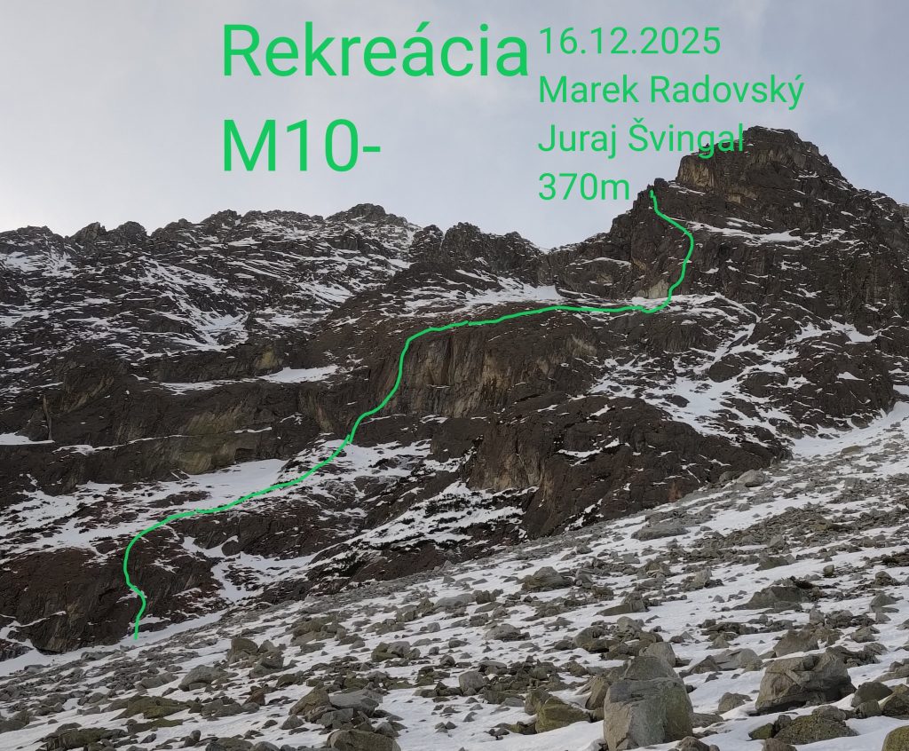 - Prvá dĺžka, pomerne príjemné lezenie na zahriatie M5