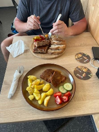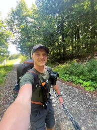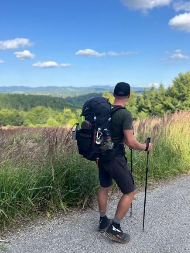 Po čtyř kilometrech jsme dorazili na Skalku. Zastavili jsme se v podniku Skavinka, dali si oběd, pivo a mezitím dobili powerbanky. K tomu se otevřel i hezký kruhový výhled na okolní hory – ideální pauza. Jen jsme ještě netušili, že tohle pivo bude na zbytek dne poslední. Za Kremnickými Baněmi jsme narazili už jen na zavřený obchod v Kunešově – a tak jsme si museli vystačit s tím, co jsme nesli v batohu. Zastávku jsme udělali u místa Medvědí pramen, kde jsme doplnili vodu. Po zbytku dne už to byl spíš pochod na autopilota – krok za krokem, bez velkého povídání.