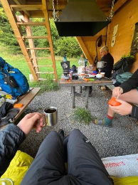 V útulni jsme potkali dva SNPčkaře – jednoho z Mikulova, který další den pokračoval opačným směrem, a byl tam také Lado, skoro sedmdesátiletý pán, který si trasu postupně prochází po etapách. Tuto část začínal stejně jako my v Donovalech, jen o den dřív. Po setmění jsme zapálili oheň v ohništi před útulnou a chvíli poseděli – teplo, klid a historky z cest. Do spacáků jsme lezli s pocitem, že tohle je zatím nejlepší místo na spaní celé etapy.